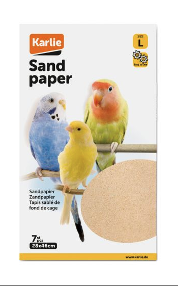 Sandpapir til bunden af fugleburet, som er et praktisk alternativ til fuglesand. Sandpapiret placeres i bunden af buret og udskiftes regelmæssigt.