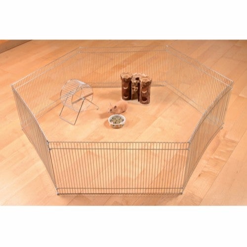 Galvaniseret løbegård i stål til indendørs brug. Buret består af 6 elementer i målene 48 × 25 cm.