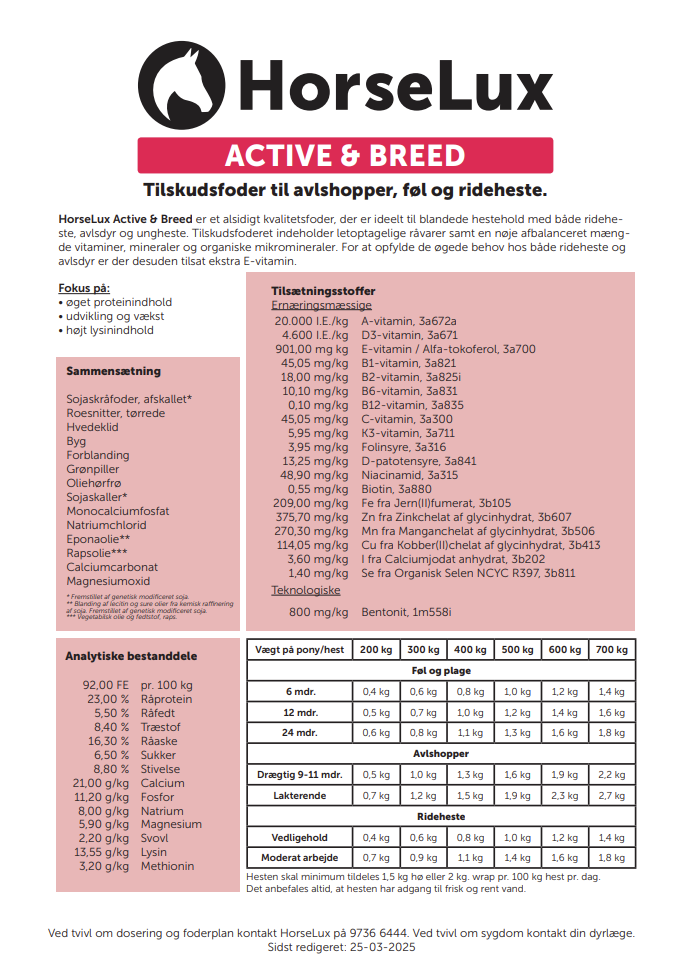 HorseLux Active & Breed giver et solidt ernæringsmæssigt fundament for drægtighed, føllets første leveår og unghestens opvækst frem til den er 3 til 3½ år. Det er samtidig et foder, der dækker behovene hos voksne rideheste med øget træningsniveau.