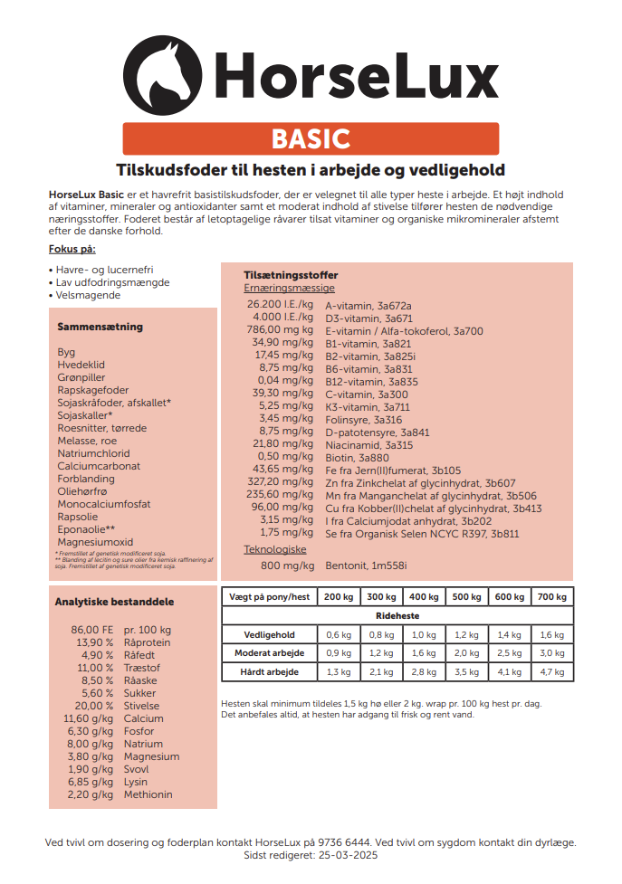 HorseLux Basic er et koncentreret og havrefrit pillefoder, der dækker behovene hos de fleste heste – både dem i let til moderat arbejde og dem i vedligehold. Foderet er udviklet med fokus på lav daglig dosering og er både havre- og lucernefrit, hvilket gør det velegnet til heste med særlige behov eller sensitiv fordøjelse.