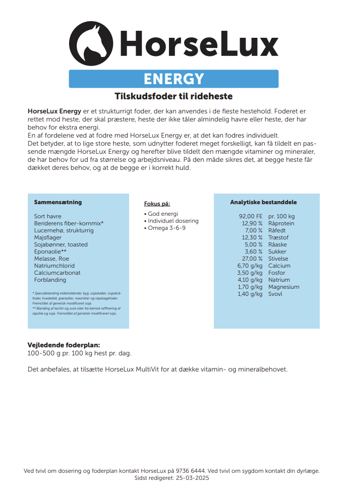 HorseLux Energy er et strukturrigt foder, der er ideelt til heste, der skal præstere, heste der ikke tåler almindelig havre, eller heste der har behov for ekstra energi. Dette foder kan anvendes i de fleste hestehold og er specielt sammensat til at understøtte hestes præstationer og arbejdsniveau.