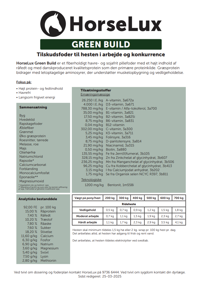 HorseLux Green Build er et velsmagende fiberholdigt pillefoder uden havre, soja og lucerne, særligt udviklet til heste i arbejde, konkurrenceheste og ungheste i vækst eller træning frem mod kåring og stævner.
