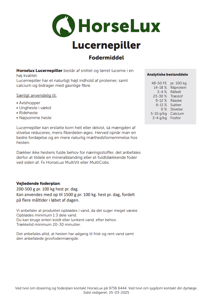 Horselux Lucernepiller består af snittet og tørret lucerne i en høj kvalitet. Lucernepiller har et naturligt højt indhold af proteiner, samt calcium og bidrager med gavnlige fibre.