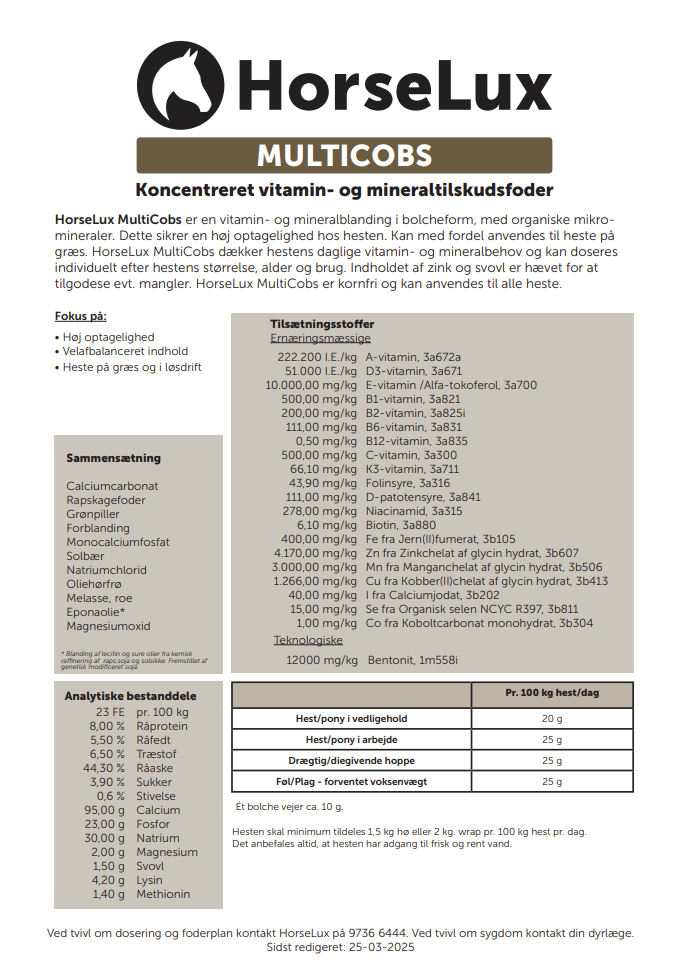 HorseLux MultiCobs er en velsmagende vitamin- og mineralblanding bolcheform, som indeholder vitaminer og organiske mineraler. Dette sikrer en høj optagelighed hos hesten. Pga. foderets form kan det særligt anbefales til heste på græs, eller til heste i løsdrift.