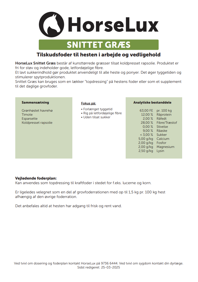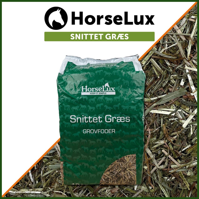 HorseLux snittet græs er en unik blanding af tre nøje udvalgte græstyper: grønthøstet havrehø, timote og esparsette, tilsat koldpresset rapsolie. Denne sammensætning sikrer et struktureret, fiberholdigt og støvfrit produkt, der understøtter hestens naturlige fordøjelse.