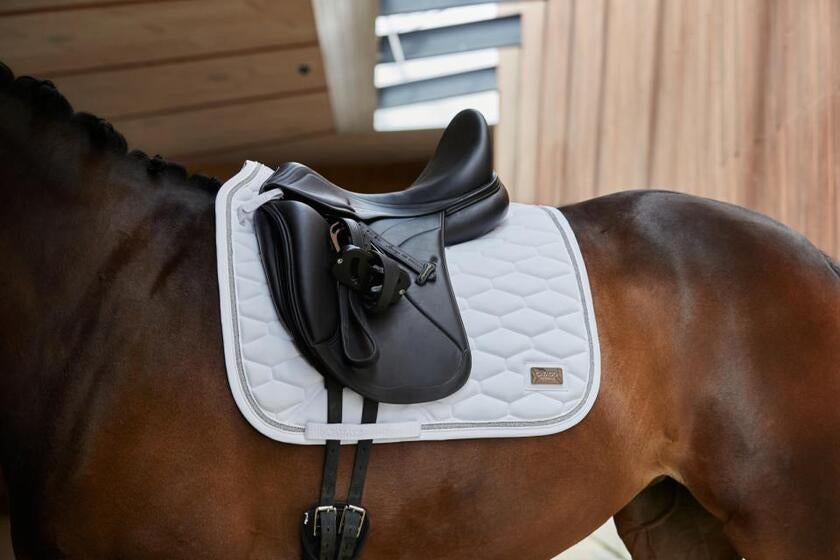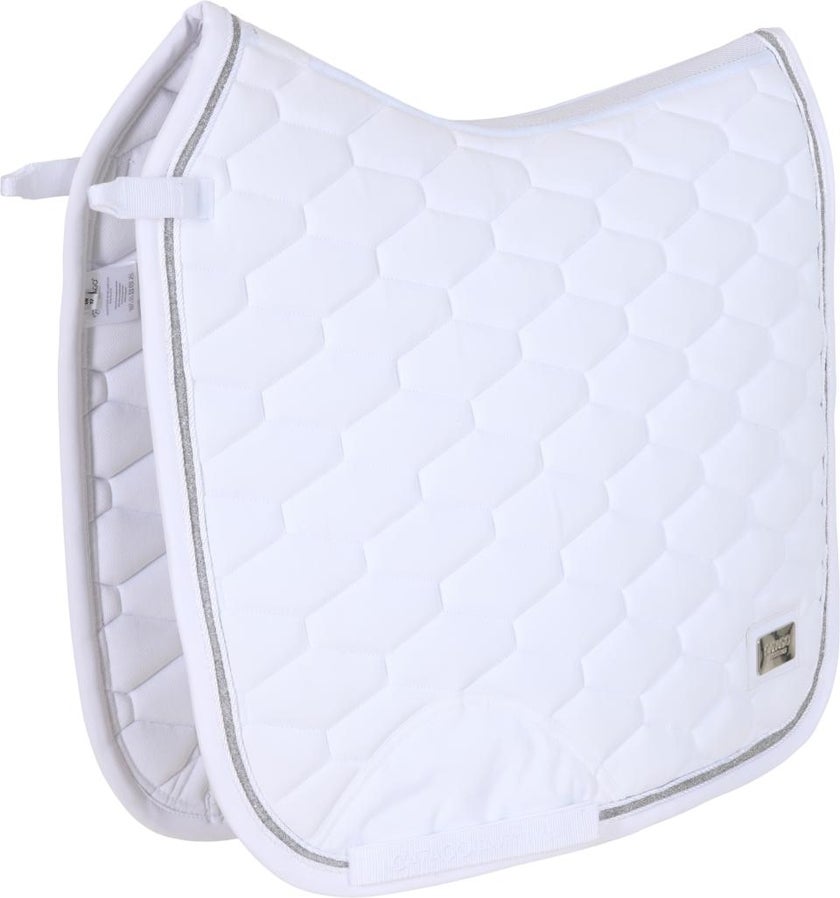 Elegant sadelunderlag designet af en glat, støvafvisende nylonjersey. Dekoreret med en flad krystal glitter trimmet tape, bundet af smalle reb rør.