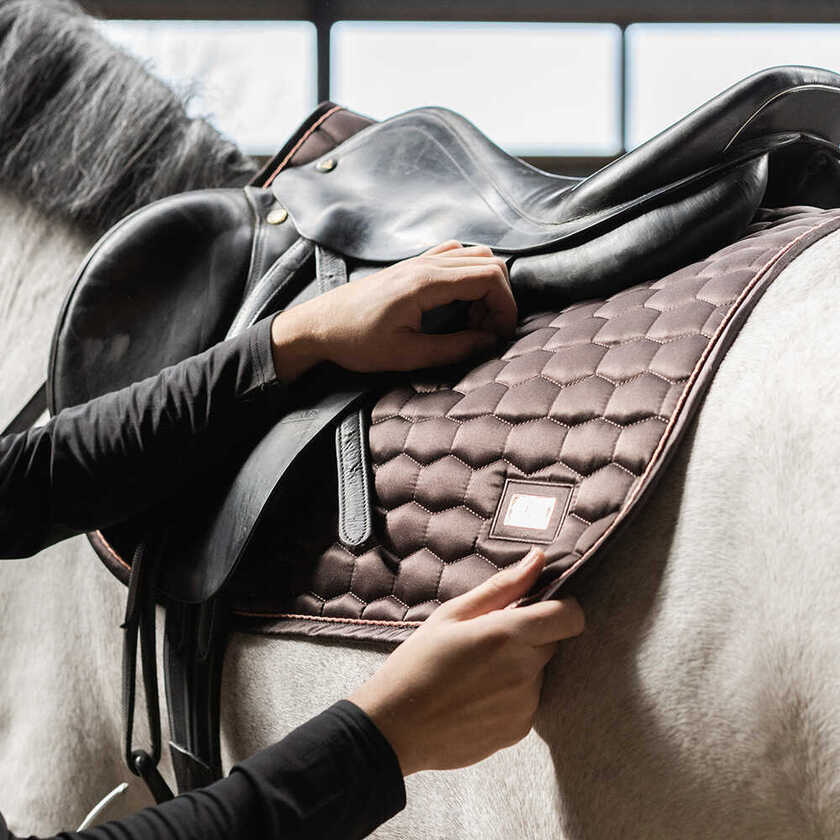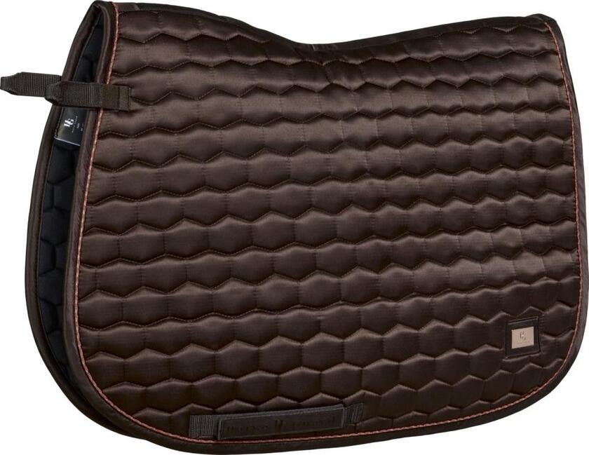 Klassisk schabrack med en elegant glans og dekorative glittereffektbånd. Cool dry-foring sikrer, at hestens pels ikke bliver irriteret af svedophobning. Hexagonal quiltning giver struktur til stoffet. Logobadge i blødt metallook. Fås i både dressur- og springmodel.