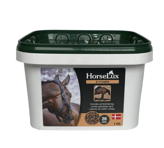 HorseLux E-vitamin er en vigtig del af hestens sundhed og velvære. Som en kraftfuld antioxidant beskytter E-vitamin hestens celler mod skader og for tidlig aldring, samtidig med at det understøtter immunsystemet og muskelfunktionen. E-vitamin er fedtopløseligt og findes naturligt i grønne blade og planter.