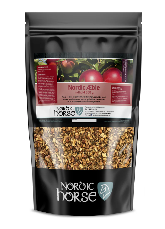 Nordic Æble er en velsmagende smagsforstærker, der kan få selv kræsne heste til at spise, hvad der serveres i krybben. Samtidig bidrager Æble med et højt fiberindhold, som understøtter og stabiliserer mave- og tarmsystemet. 100 gram Nordic Æble svarer til fiberindholdet i et helt kilo friske æbler, hvilket gør det til en koncentreret og praktisk kilde til æblets mange fordele.
