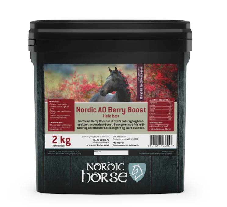 Nordic AO Berry Boost er et 100 % naturligt og bredspektret antioxidant-boost, der beskytter hestens celler og væv mod skader forårsaget af frie radikaler. Med sin særlige sammensætning af forskellige bær, som alle er rige på antioxidanter, bidrager AO Berry Boost til at opretholde både indre og ydre sundhed hos hesten.