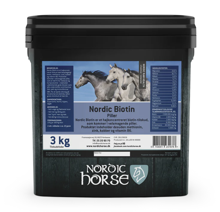 Nordic Biotin er et pelleteret og højkoncentreret tilskud til heste, der har udfordringer med hud, pels, hår eller hove. Tilskuddet indeholder letoptageligt biotin kombineret med methionin, zink, kobber og vitamin B6, som alle spiller en central rolle i at opretholde sunde hove, en stærk pels og et velfungerende immunforsvar.