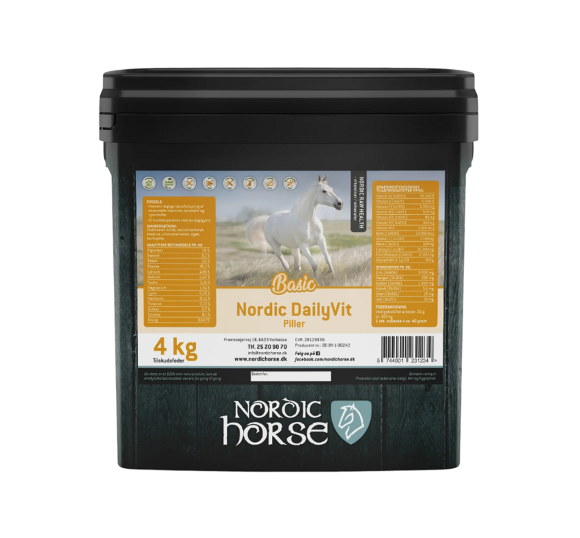 Nordic DailyVit er hestens daglige basisforsyning af essentielle vitaminer, mineraler og sporstoffer. Som en del af Basic-serien (tidligere kendt som Nordic Mineral) er DailyVit udviklet til at sikre en enkel og velsmagende løsning, der dækker behovet hos heste, som primært fodres med grovfoder.