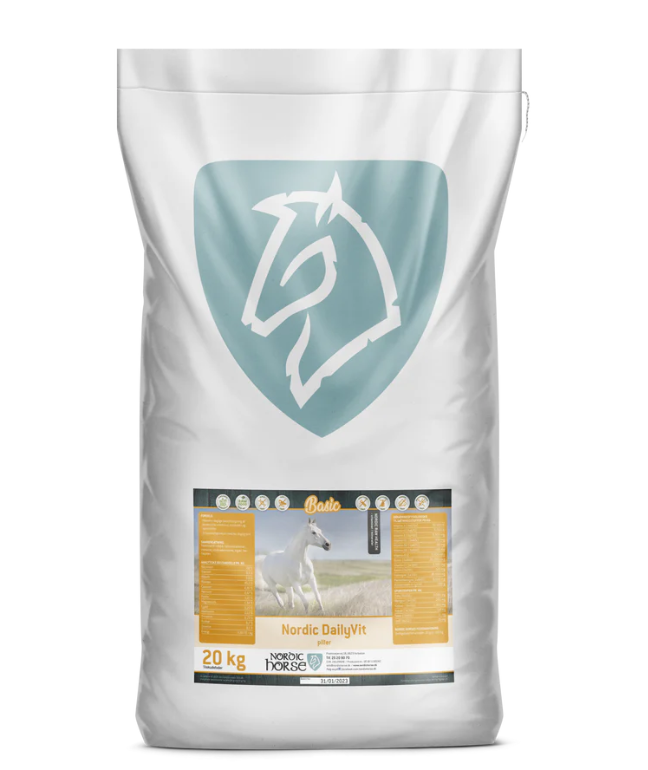 Nordic DailyVit er hestens daglige basisforsyning af essentielle vitaminer, mineraler og sporstoffer. Som en del af Basic-serien (tidligere kendt som Nordic Mineral) er DailyVit udviklet til at sikre en enkel og velsmagende løsning, der dækker behovet hos heste, som primært fodres med grovfoder.