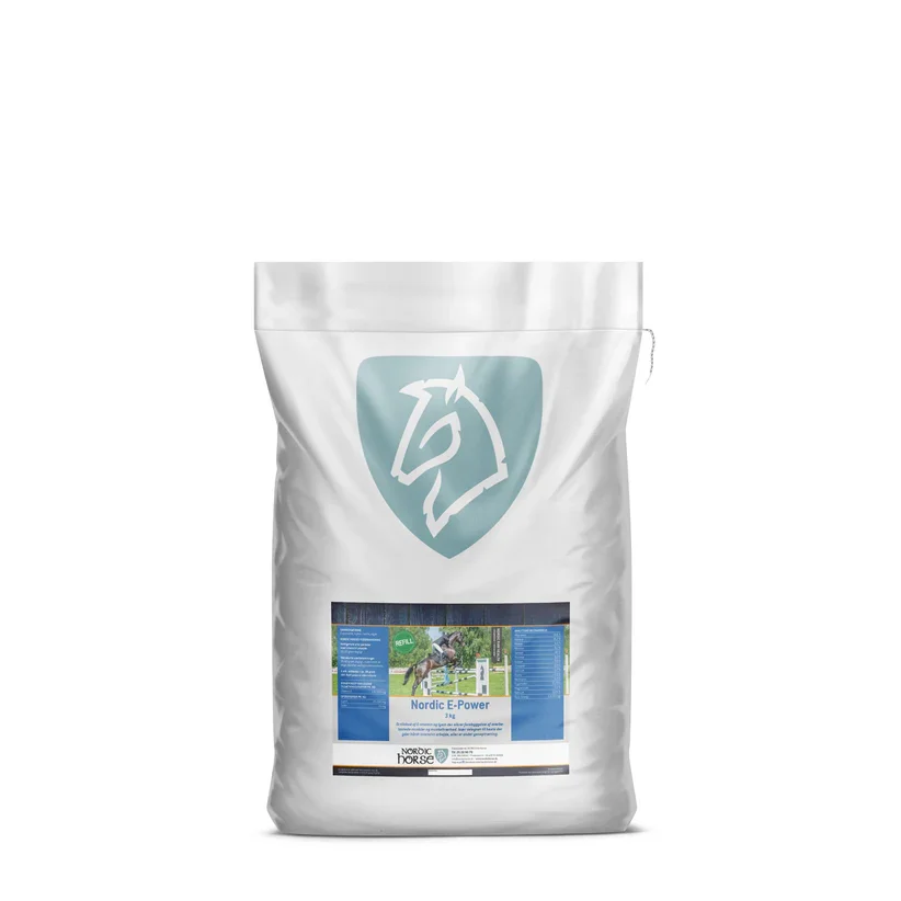 Nordic E-Power er et pelleteret tilskud af E-vitamin og lysin, der er udviklet til at forebygge muskeltræthed og overbelastede muskler. Tilskuddet er særligt velegnet til heste i hård træning, heste under genoptræning, avlshopper uden adgang til frisk græs samt heste med muskelspændinger eller muskelsygdomme.