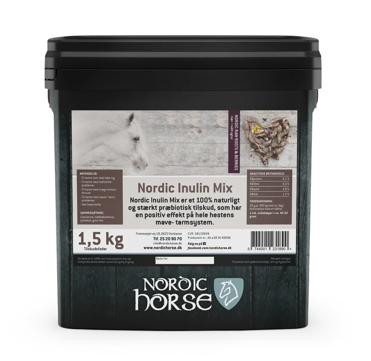 Nordic Inulin Mix er et 100 % naturligt og stærkt præbiotisk tilskud, der har en positiv effekt på hele hestens mave- og tarmsystem. Med sit høje indhold af inulin og grøn te understøtter blandingen både fordøjelsen, stofskiftet og immunforsvaret. Samtidig virker Inulin Mix blodsukkerstabiliserende og kan være en effektiv hjælp til heste, der skal tabe sig, heste med stofskifteproblemer eller heste med sart mave.