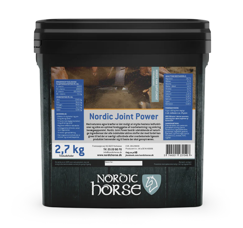 Nordic Joint Power er udviklet til heste med udfordrede eller overbelastede led og sener samt til heste i genoptræning. Joint Power består udelukkende af naturlige ingredienser i høj kvalitet, sammensat for at styrke funktionen, stabiliseringen og balancen i og omkring leddene.