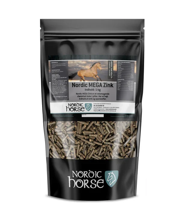 Nordic MEGA Zink er et velsmagende pelleteret diætetisk foder med et højt indhold af letoptageligt zink og sporstoffer. MEGA Zink er udviklet til heste, der er i underskud af zink, og bør altid tildeles i samråd med dyrlæge. Den lille daglige udfodringsmængde gør det nemt at anvende i praksis.