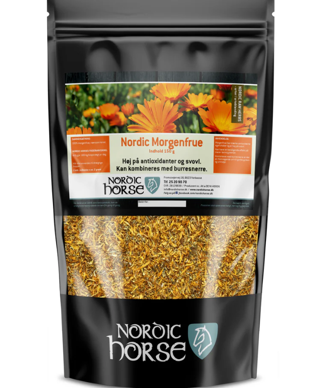 Nordic Morgenfrue er et naturligt tilskud med stærke antioxidative egenskaber og et højt indhold af svovl. Urten er kendt for sin beroligende virkning på mave-tarmsystemet og kan dermed være en værdifuld støtte til heste med sart fordøjelse eller behov for ekstra balance i tarmsundheden.