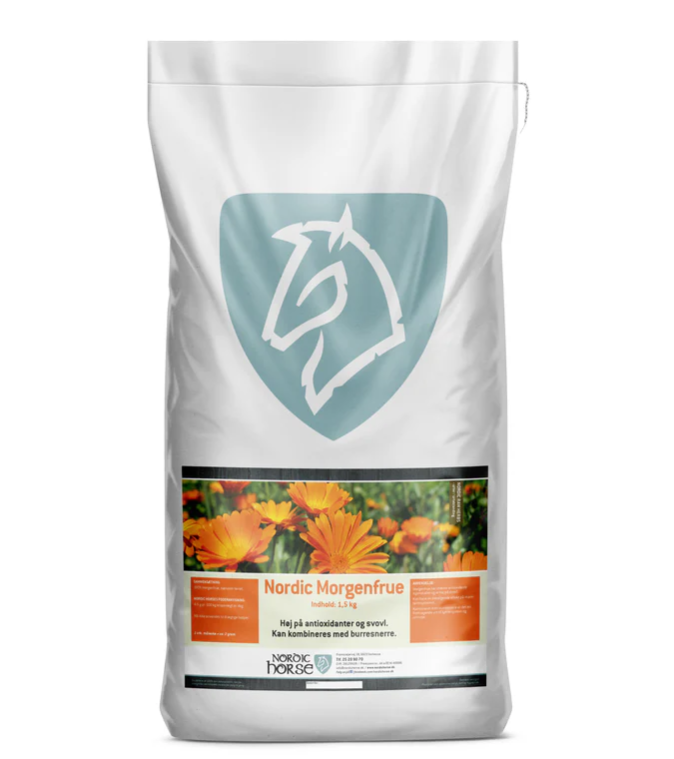 Nordic Morgenfrue er et naturligt tilskud med stærke antioxidative egenskaber og et højt indhold af svovl. Urten er kendt for sin beroligende virkning på mave-tarmsystemet og kan dermed være en værdifuld støtte til heste med sart fordøjelse eller behov for ekstra balance i tarmsundheden.