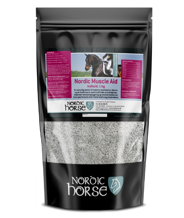 Nordic Muscle Aid er en naturlig støtte til hestens muskulatur. Aminosyrer kombineret med kraftfulde antioxidanter, understøtter de arbejdende muskler og er med til at øge muskelopbygning, træningstolerance, udholdenhed og muskelrestitution hos sportsheste eller heste med svag muskulatur.