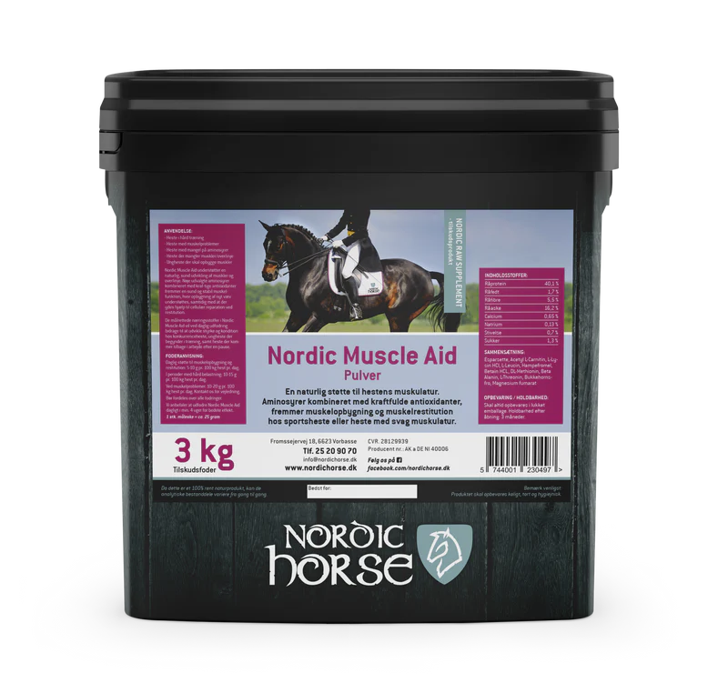 Nordic Muscle Aid er en naturlig støtte til hestens muskulatur. Aminosyrer kombineret med kraftfulde antioxidanter, understøtter de arbejdende muskler og er med til at øge muskelopbygning, træningstolerance, udholdenhed og muskelrestitution hos sportsheste eller heste med svag muskulatur.