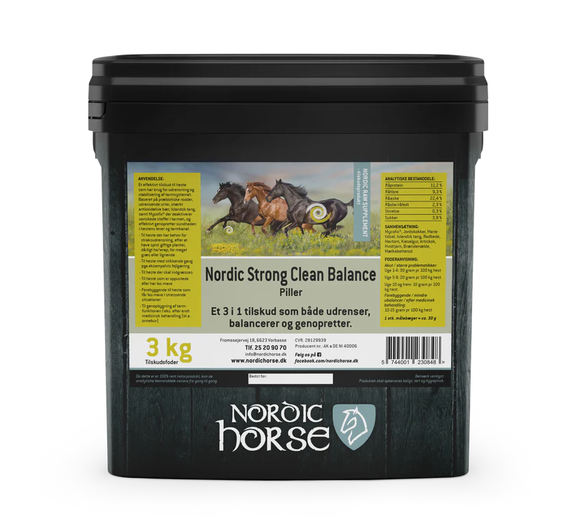 Nordic Strong Clean Balance er dermed et alsidigt og kraftfuldt supplement, der kombinerer naturlige råvarer og avanceret teknologi for at styrke hestens fordøjelse, immunforsvar og generelle trivsel.