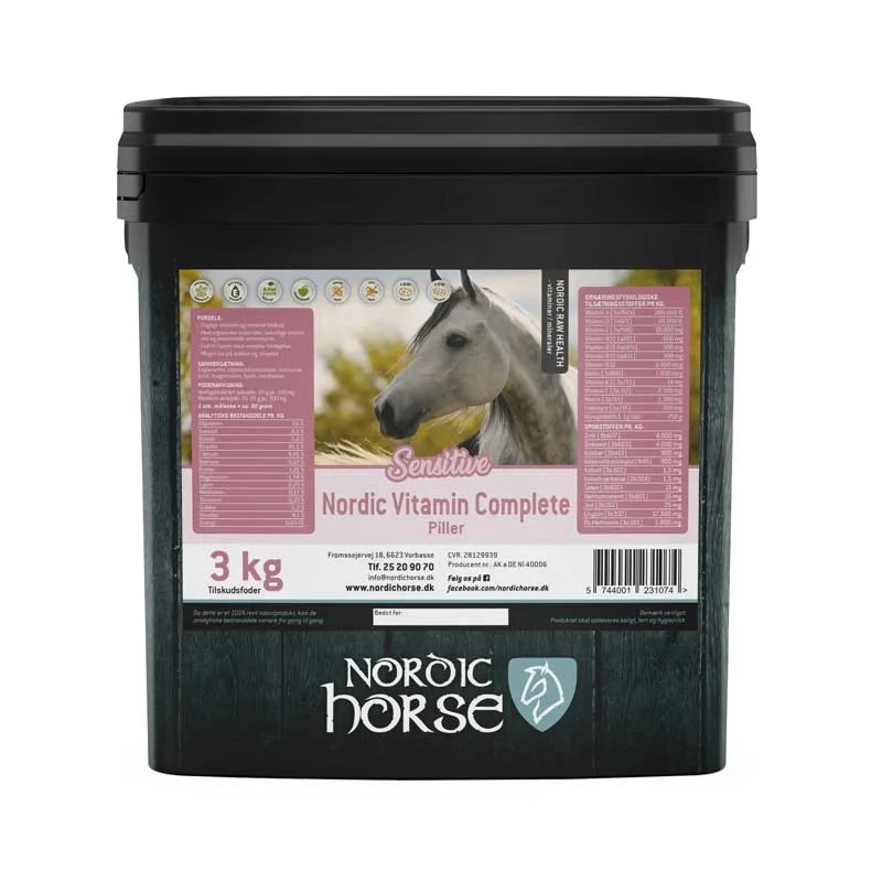 Nordic Vitamin Complete er dermed et komplet og skånsomt valg, der både dækker hestens daglige behov for vitaminer, mineraler og sporstoffer og samtidig tilfører de essentielle aminosyrer, som kroppen har brug for til en sund og velfungerende balance.