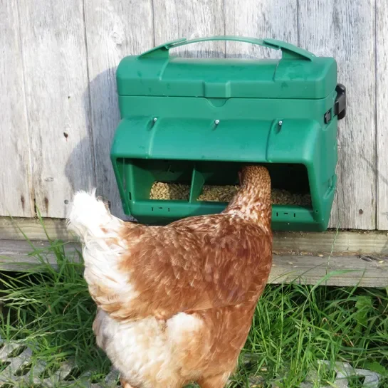 Spildfri foderautomat til fjerkræ, designet til montering på trådvæg. Muliggør nem påfyldning udefra hønsegården og passer til alle typer fjerkræ. Leveres med beslag og kroge til ophæng på trådnet. Fremstillet i rengøringsvenlig plast og har en kapacitet på ca. 5 kg foder.