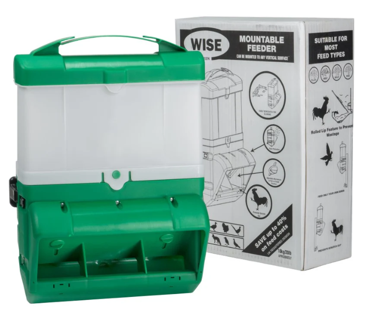 Spildfri foderautomat til fjerkræ, designet til montering på trådvæg. Muliggør nem påfyldning udefra hønsegården og passer til alle typer fjerkræ. Leveres med beslag og kroge til ophæng på trådnet. Fremstillet i rengøringsvenlig plast og har en kapacitet på ca. 10 kg foder.