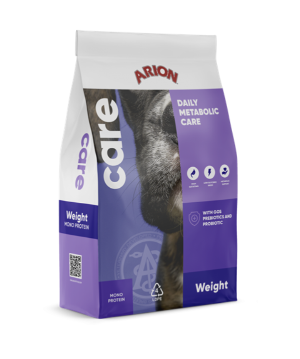 ARION Care Weight er et kvalitetsfoder udviklet til hunde med særlige behov for vægtkontrol. Care Weight er sammensat til at støtte hundens stofskifte, fremme fedtforbrændingen og hjælpe med vægttab uden at det går ud over muskelmassen eller hundens trivsel.