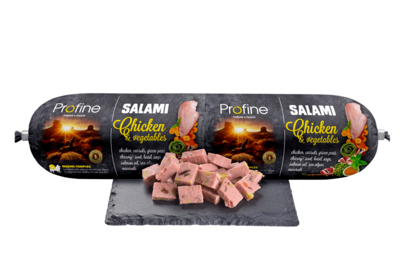 Med et højt kødindhold er denne pølse ideel til hunde, der er lidt kræsne. Kyllingens proteiner er fremragende til opbygning af muskelmasse, og med den lidt højere fedtprocent på 12%, er den særlig velegnet til aktive hunde. Derfor er Profine Salami et godt valg til jagthunde, politihunde og andre brugshunde.