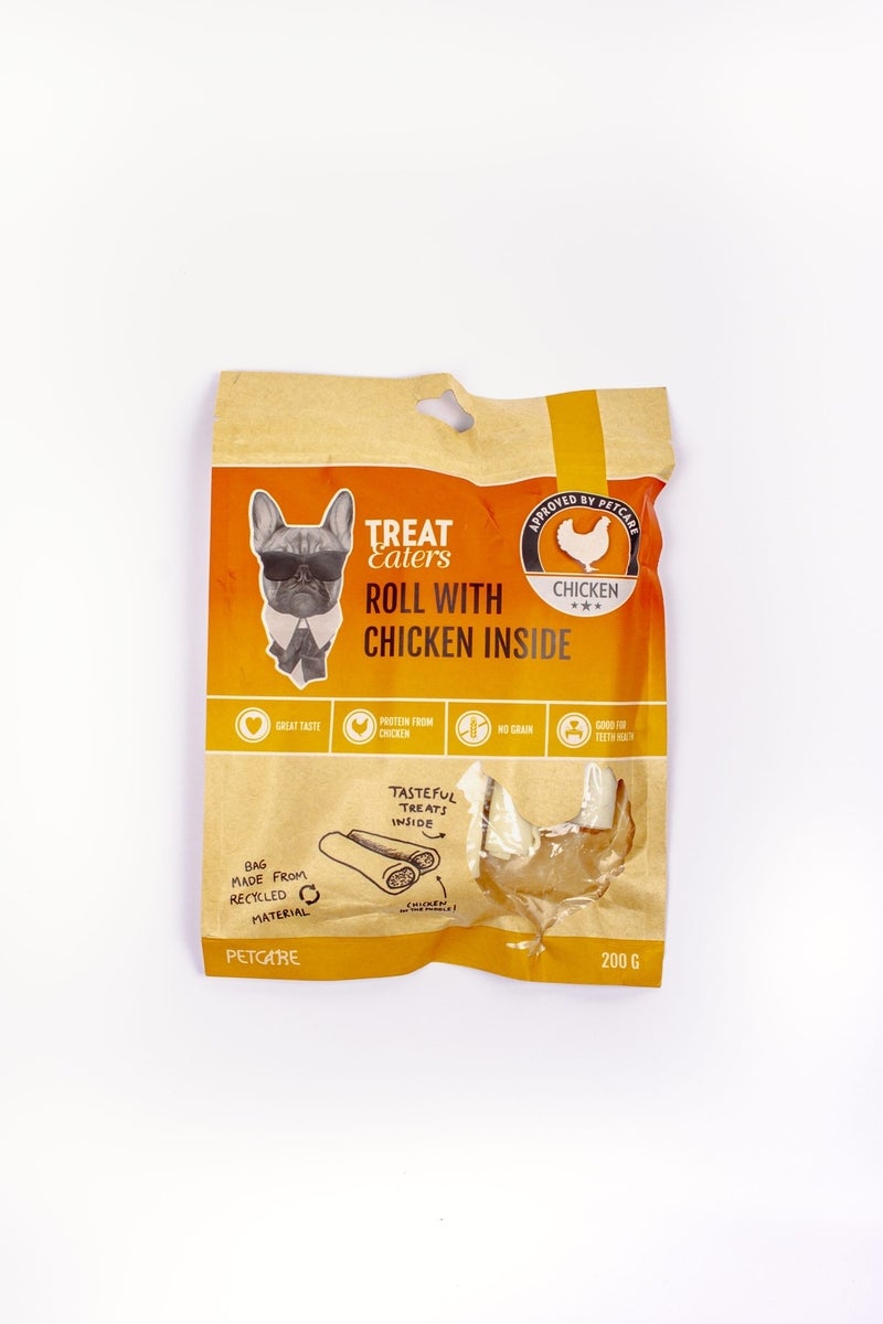 Lækker kornfri snack fra Treat Eaters, hvor hunden skal arbejde sig ind til det smagfulde kylling i midten. En god snack som hjælper med at holde dine hunds tænder rene og sunde. Posens emballage er lavet af genbrugspapir og med genluk.