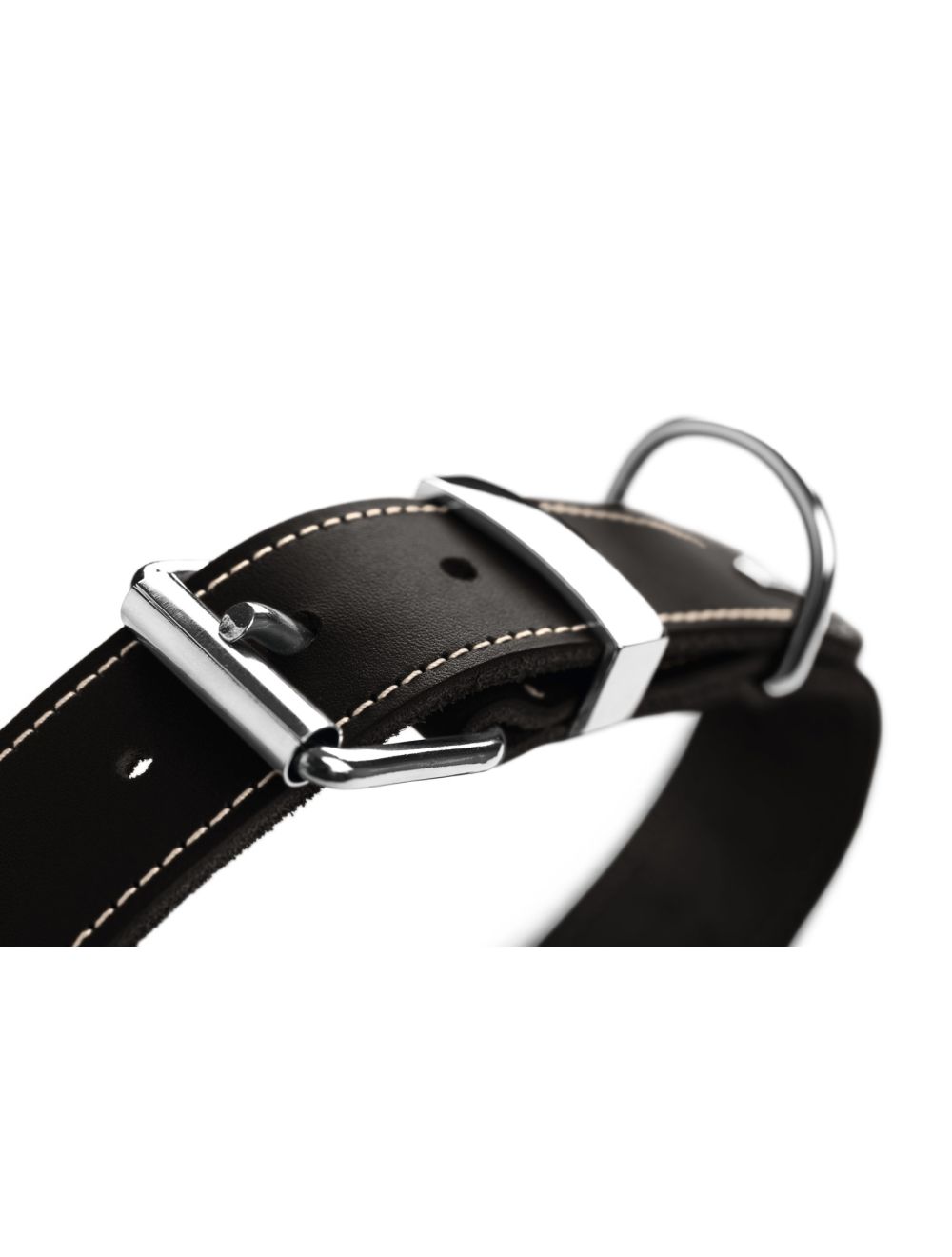 Den brede kontaktflade sikrer optimal trykfordeling – ideelt hvis hunden pludselig trækker, fx ved synet af naboens kat eller en legekammerat. Læderet er kraftigt indfedt og derfor ekstra modstandsdygtigt over for slid og vejr, hvilket gør halsbåndet særligt velegnet til hundesport og aktivt udeliv.