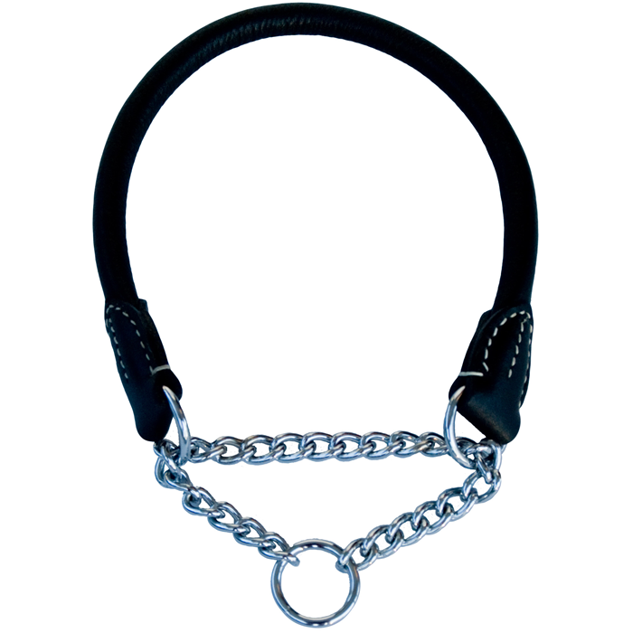 Kvalitets dressur-halsbånd af særligt blødt, rundsyet okselæder med hvide stikninger og kæde. Behageligt for hunden at have på.Halvkvæl