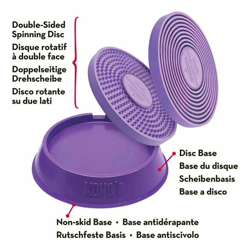 KONG Licks Spinz' roterende, teksturerede tallerken rummer mad eller godbidder, og inviterer til at slikke og frigive glade hormoner. Den dobbeltsidede plade tilbyder to teksturer til at berige variationen, og er aftagelig for nem rengøring. Derudover renser den hundes tunge, og fremmer tandsundhed og frisk ånde. Den skridsikre base holder legetøjet på plads.