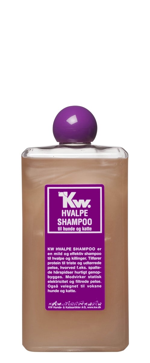KW hvalpe shampoo er en mild og effektiv shampoo til hvalpe og killinger. Denne shampoo tilfører protein til triste og udtørrede pelse, hvorved f.eks. spaltede hårspidser hurtigt genopbygges. KW hvalpe shampoo modvirker også statisk elektricitet og filtrede pelse. Også velegnet til voksne hunde og katte.