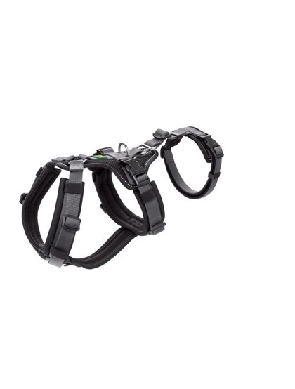 Et bevægeligt punkt mellem selen og fastgørelsesringene sørger for, at trækket fra linen fordeles jævnt, hvilket aflaster hunden og forlænger selens levetid.