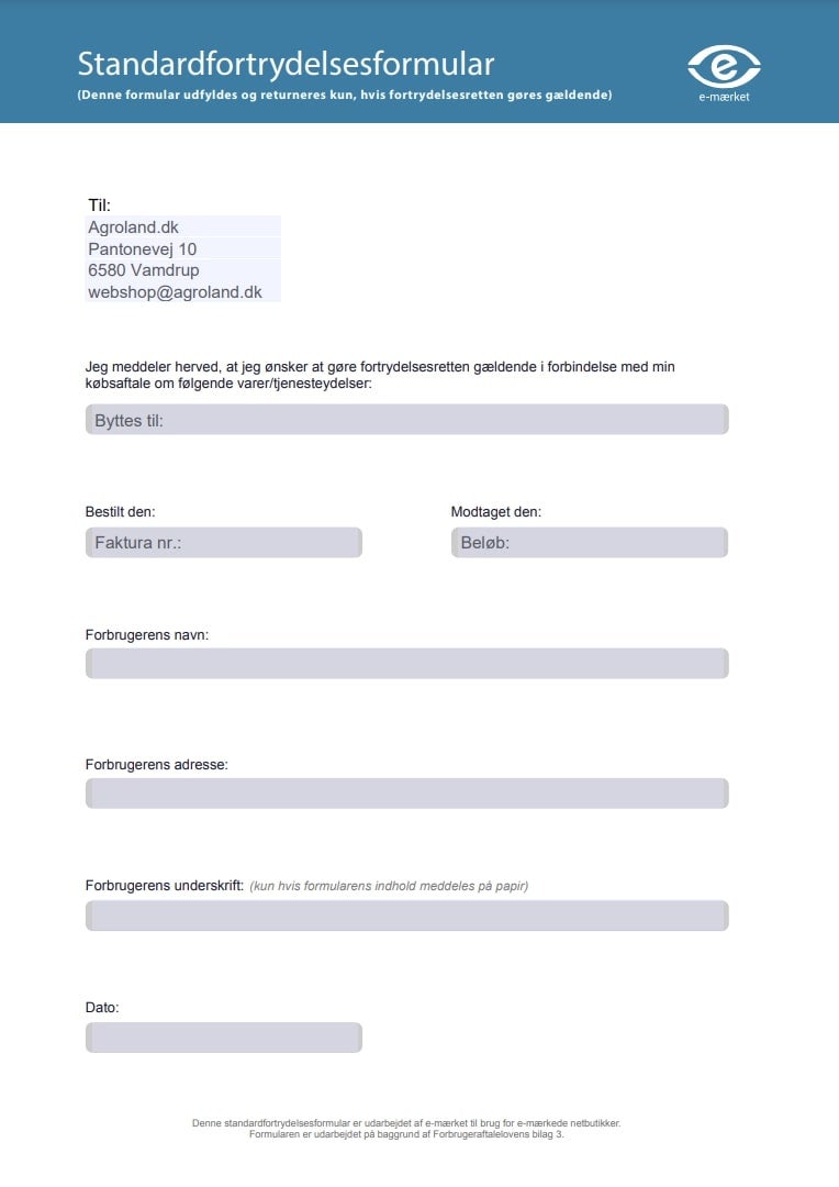 Det betyder at ethvert køb kan fortrydes, uden at der skal forklares hvorfor. Det er ikke muligt at fortryde ved at nægte modtagelse af varen, uden at du har givet os tydeligt meddelelse omkring dette. Du skal inden 14 dage fra modtagelse give os meddelelse om, at du ønsker at fortryde dit køb. Fortrydelsesfristen udløber 14 dage efter den dag, du har modtaget din vare eller får den sidste vare i fysisk besiddelse, når det drejer sig om en aftale om flere forskellige varer, som er bestilt i én ordre og som leveres enkeltvis. Du kan sende en mail til webshop@agroland.dk eller benytte standardfortrydelsesformularen, som du finder nederst i handelsbetingelserne.