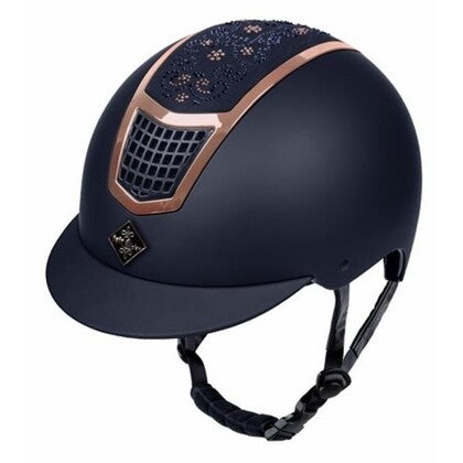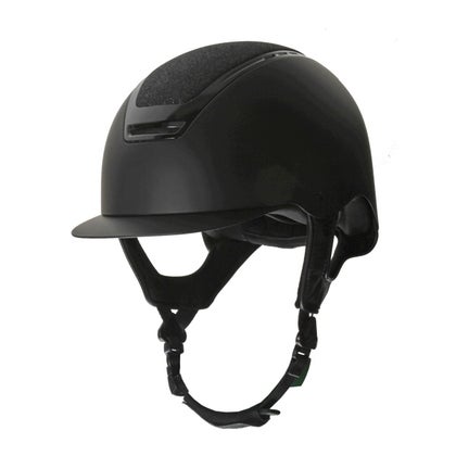 Ridehjelm Quantinum spotlight er en moderne, stilfuldt dekoreret ridehjelm, der kombinerer høj sikkerhed med et elegant design. Skallen og skyggen er lakeret med en skinnende højglansfinish, der giver et eksklusivt udtryk. Den er ekstra komfortabel takket være foring af memoryskum, som former sig efter hovedet.